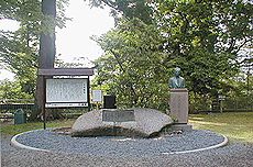 土井晩翠作詞「荒城の月」碑と、土井晩翠(仙台生まれ)像 (右)本丸跡に建つ騎馬姿の「政宗」隻眼のため「独眼竜」と称された