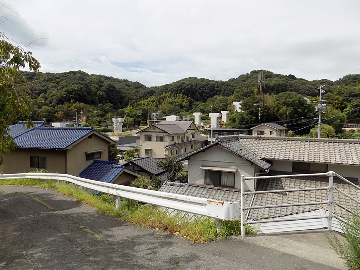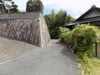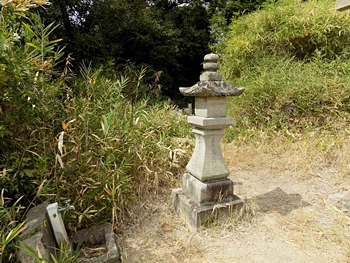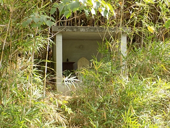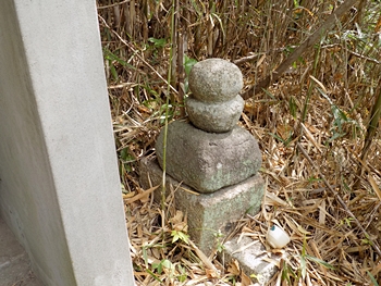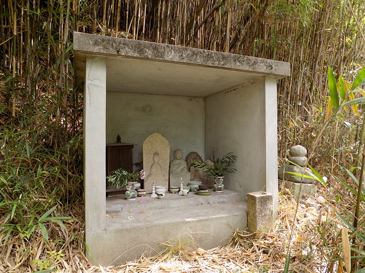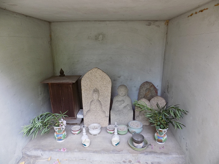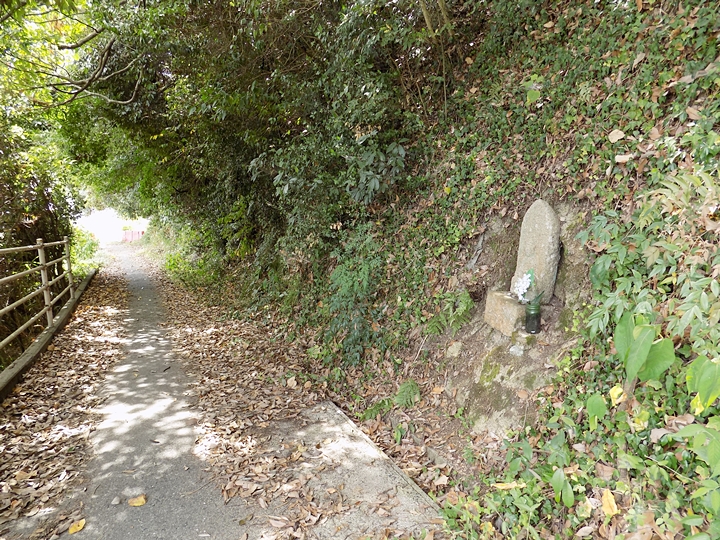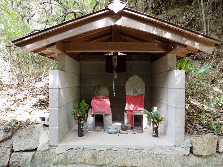 中山城跡の北側の狭い市道をノンビリと上がって行きますと、左側斜面にコンクリート製の祠が…GoogleMap≠ノは、「長和・草戸新四国八十八ヶ所第14番常楽寺」と記載があります。祠の右傍らには、五輪塔も…