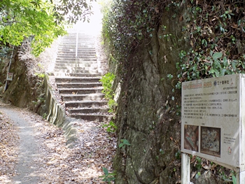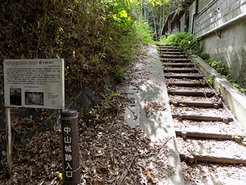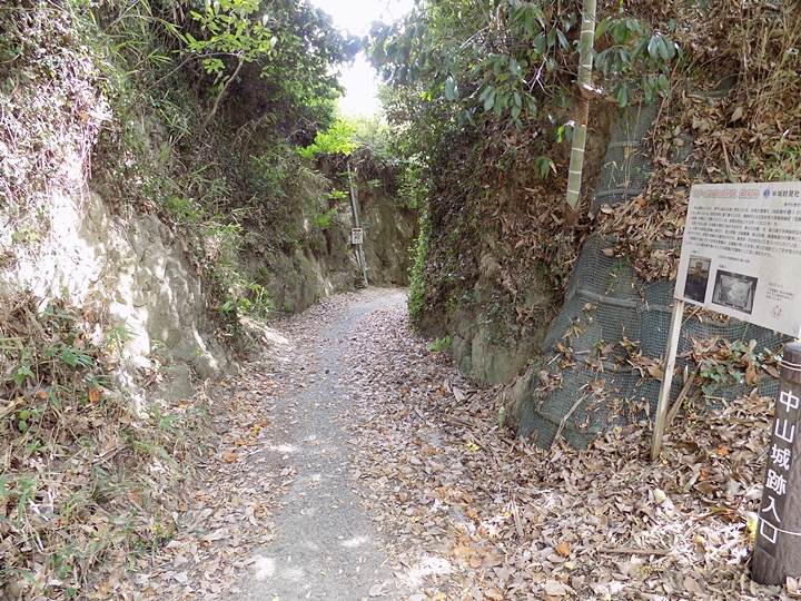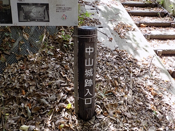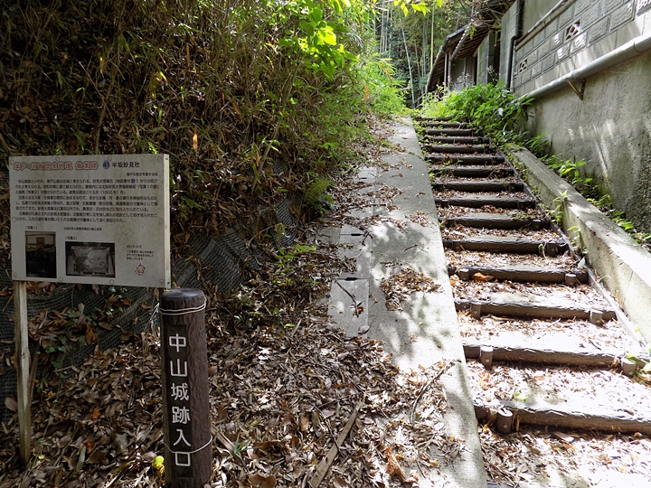 「長和・草戸新四国八十八ヶ所第12番焼山寺」を通り過ぎますと、スグに右手に階段上り口脇に『中山城跡入口』の案内標識が…結構新しいので、ここ近年に設置されましたのかも…