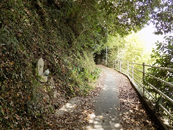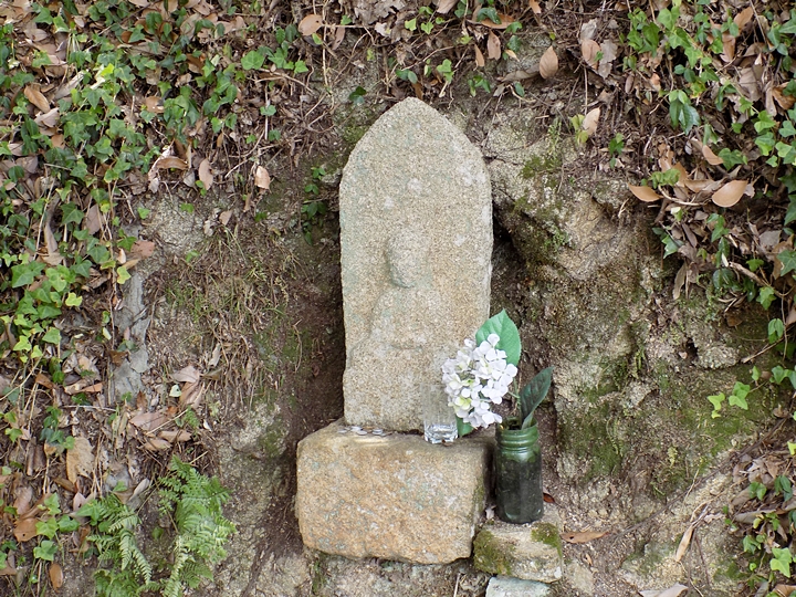 そうしますと、右側(山側)の斜面に石仏が…これは、GoogleMap≠ナ確認しますと、「長和・草戸新四国八十八ヶ所第16番観音寺」のようであります。どなたか、紫陽花の花を供えておられますけど造花かも(^-^)