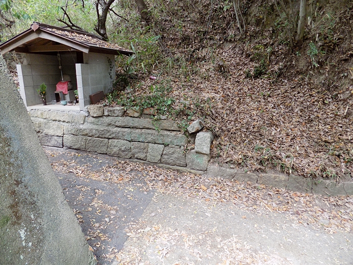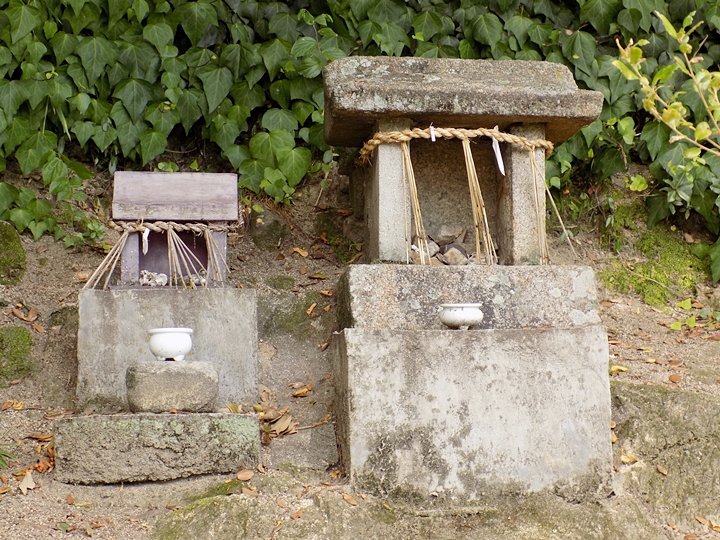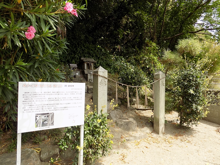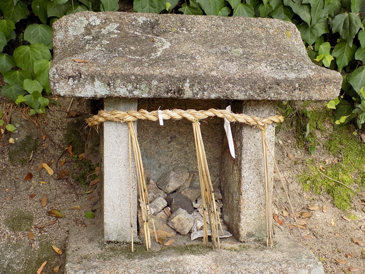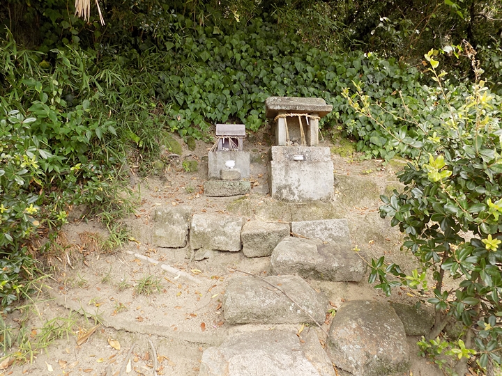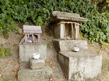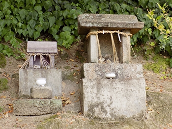 ここの道祖神に祀られている牡蠣の殻は近所の岩肌(地上4m位の高さ)に付着していたもので、以前にこの辺りまでは海であったことを示す。