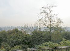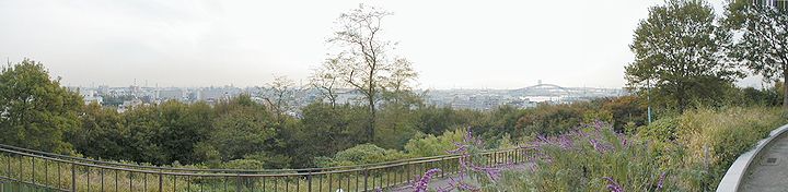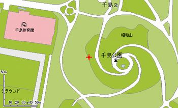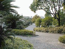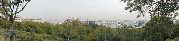 公 園の中にはいると、中心部は山になっています(昭和山 --- 地下鉄工事ででた土を使って出来た人工の山)。そのまま坂道を上り頂上に出ると、そこから周辺 の夜景を一望することが出来ます。少し周りの木がじゃまをして見難いところもありますが、頂上には屋根付きのベンチがあり、風通しもよく、夏場の夕涼みに は最適です。