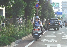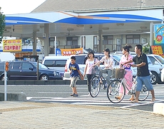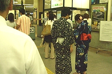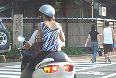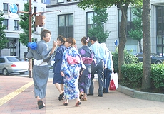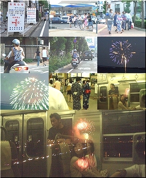 花火大会会場方向への交通規制の立て看板、花火見物に出かけています浴衣姿の若者達、バイクに二人乗りで向かいます若いカップル。