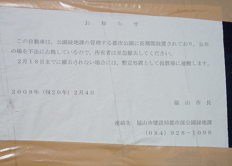 昨年の10月初旬頃から放置されていますこの車、今月の初め頃でしたか…ヤッと市の公園緑地課の手により、注意喚起の下記の警告文書が車体に貼り付けられておりました(^-^)