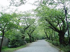 銅門は、江戸時代の小田原城二の丸の表門で、明治3年(1970)の小田原廃城後、明治5年に解体されるまで、江戸時代を通してそびえていました。往時は、馬出門土橋(現在のめがね橋)から城内に入り、銅門を通って二の丸御殿や本丸、天守閣へと進むようになっていました。