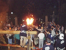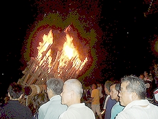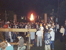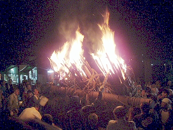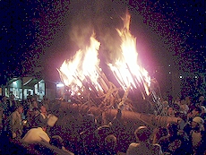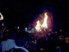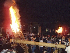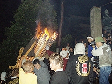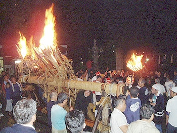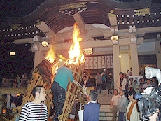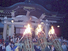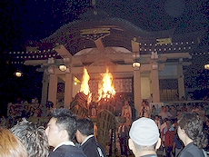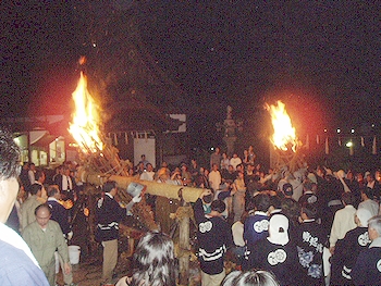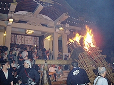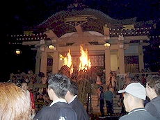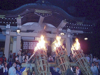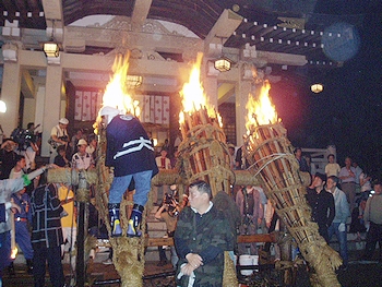 ↑↓ 拝殿正面に3本の大松明が無事に奉納されましたのがP.M.11:30でした(^.-)☆ 長かったですねぇ〜
