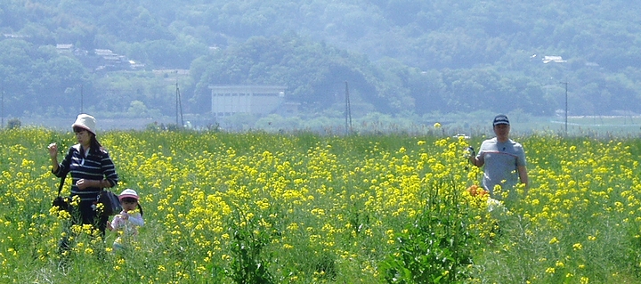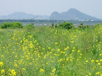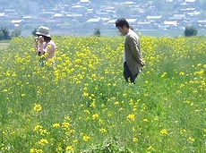 笠岡市のふれあい空港周辺で29日、「菜の花フェスタ2007」が開かれ、約1万人が訪れた。菜の花オンステージで、地元の保育園児31人による鼓笛隊演奏でスタート。会場には、地元で採れたレタス、イチゴなどの野菜や果物、菜種油や菜の花のはちみつなどを即売する地産地消コーナー、菜の花の入った野菜いためなどの料理ショーコーナーも並んだ。周辺の菜の花畑に入り、カメラで撮影する家族連れも多かった。