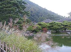 その他、讃岐特有の鬼瓦を集めた瓦館などと相まって、さながら県下物産の見本市会場のようです。また、左手に折れれば、南湖のほとりを中心にめぐる池泉