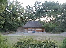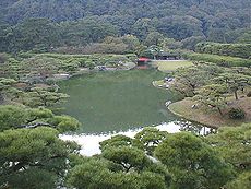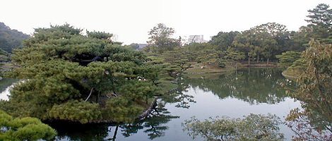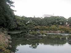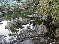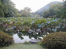 毘沙門天祠を (中)群鴨池を (右)花菖蒲園を