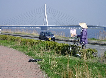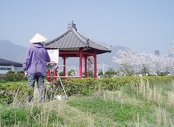 サクラ吹雪を少し眺めてから…との想いで出かけますと、ご年配の方がサクラ吹雪の舞う中で筆を走らせておられましてラッキー(^_^)v