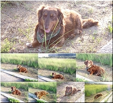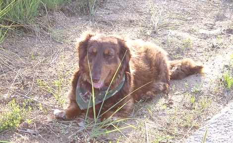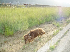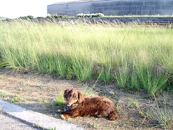 この日は少々暑かったのでしょうか…急に歩行を止めまして土手に座り込み芦田川川面方向に眼を向けて休んでおりましたゴンchan。