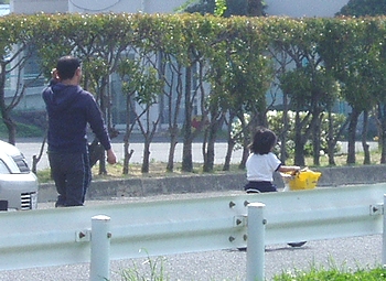 補助車輪を上げての練習時には、お父さんが心配そうに手を貸しておられましたけど、そのうち飽きたのでしょうか…また補助車輪を降ろして一人でノンビリと自転車乗りを楽しんでおりましたチビッコ。