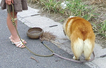 ワンchanの食器(勿論、中にはワンchanの餌も入っております)をリード線に繋ぎまして一緒に散歩とはイィですねぇ〜