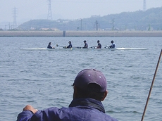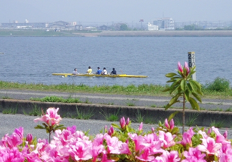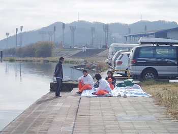 この場所を抜けますと、今度は前方に、レガッタの練習をしておられます方々の靴・おやつ・飲み物が河川敷に。
