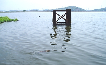 これはいつでしたか…テニスコート横の土手下の護岸をノンビリと歩いておりましたら、急にゴンchanが河面際に急ぎますから、また何か食べ物でも落ちているのだろぅ…と後から付いて行きました。
