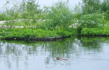 ほとんどキャベツを食べ終わりました頃、1匹のヌートリアがゴンchanに気付きましてサッと護岸から離れて行きまして、暫く経てからもぅ1匹もゴンchanに気付きました様子。