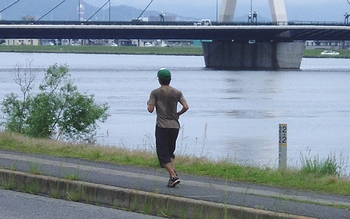 2時間のジョギングを終え、土手に上がり暫く河川敷・芦田川川面に眼を向けておりましたら、ヤッとお一人、小水呑橋〜芦田川大橋間を川下方向に走っておられます若者が眼に入りました(^-^)