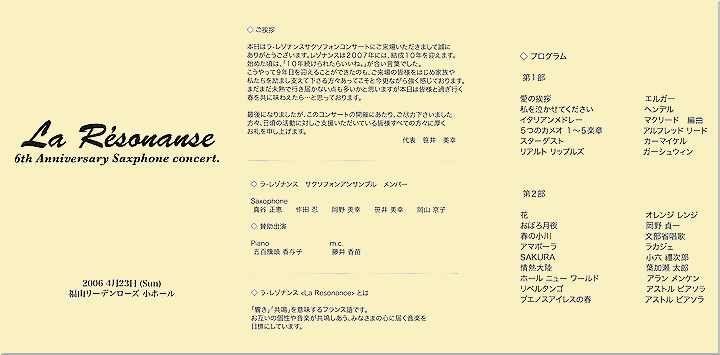 本日はラ・レゾナンスサクソフォンコンサートにご来場頂きまして、誠に有難うございます。レゾナンスは、2007年には結成10年を迎えます。始めた頃は、「10年続けられたらいいね」が合い言葉でした。