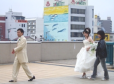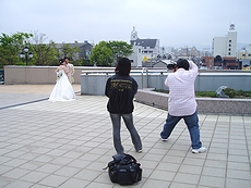 (右)リーデンローズ正面入口前では、なにやら撮影を…