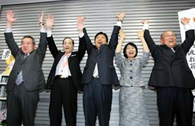 【写真説明】トップ当選を確実にし、支持者らと万歳する宇田さん(中央)。右隣は妻の真弓さん。