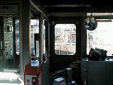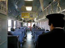 (中)島原鉄道の車輌内で (右)島原鉄道沿線の景観を車窓から