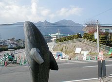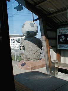 サッカーの名門“国見高校”に敬意を表してこんなモニュメントが… (中)島原鉄道“国見駅”通過時に (右)車窓から有明海を
