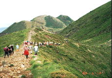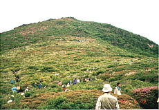 (右)平治岳への登山は翌日・6/11(日)の予定でしたが、天気予報では降雨のため、法華院温泉でユックリする間もなく、小雨の中を登って来ました。これは大戸越の景観ですけど、ご覧の通り“ミヤマキリシマ”が大変綺麗でした。ほのぼのと山の湯の夜