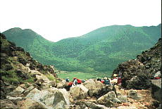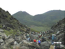 (左)(中)この岩の海を下りましたところが“坊がつる”“法華院温泉”です。前方の山の左が“平治岳”、右が“大船山”です。