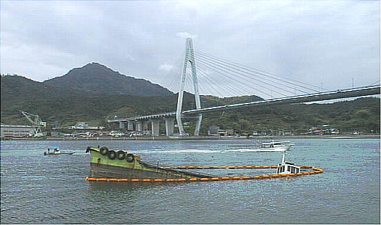 生口橋下で給水船沈没 --- 老朽化で船底の穴から進水 ---