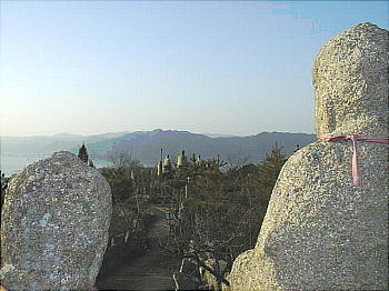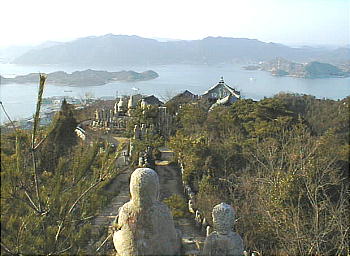 標高 227mの白滝山は、今から約 420年前、村上水軍の村上吉充が観音堂を建立したと伝えられ、文政10年(1827年)柏原伝六とその弟子達によって五百羅漢の石仏が作られました。