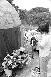 女性の願い事をかなえるお地蔵さんとして、古くから親しまれて いる因島市三庄町の「鼻の地蔵」が、地蔵鼻岬の自然石に刻み祭られてから四百年を迎える。これを記念して地元住民たちが二十九日、四百年祭を開いた。