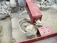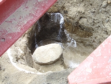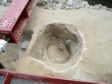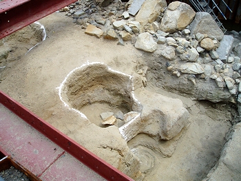 ただ、外堀石垣の上端から北側約2mの位置で、石垣ラインに沿って一列に円形の穴が9箇所検出されました。直径1.5m、深さ1mほどのすり鉢状の穴で、その中に直径20cm〜30cmの柱の痕跡が検出されたことから、柱を立てるための穴と判断された。しかも、石垣に沿って3m間隔で掘られていることから、石垣上に造られていた土塀を支える柱(控柱)の跡と考えられた。