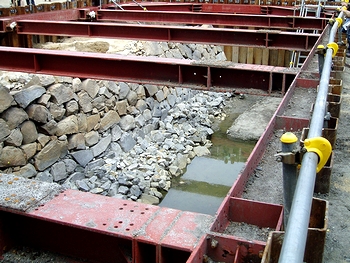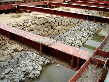 また、石垣の基底部の前面には頭大の石材(捨石)が、幅1.5m、高さ0.5mにわたり乱雑に積み上げられていた。これは、石垣の地盤が砂であることから、堀の水の流れによって基礎石下の砂が洗われて(洗掘)、石垣が崩壊することを防ぐ役割を果たしたものと考えられる。