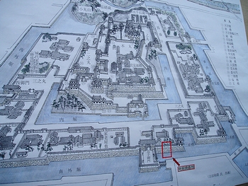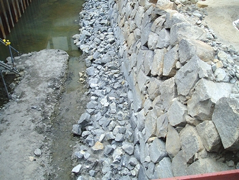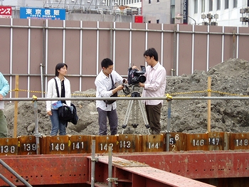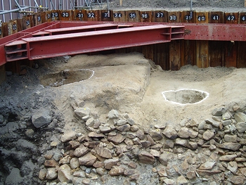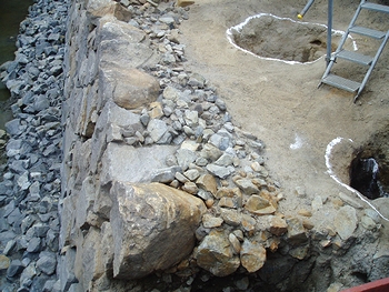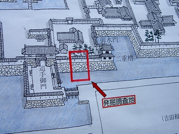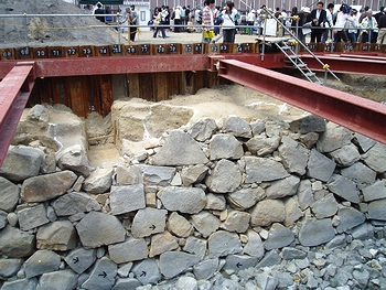 発掘は、市による駅前の地下送迎場新設計画に伴い、市教委が2月中旬から実施。高さ3メートル、幅25メートルの外堀の石垣や、国内最大級とみられる土塀を支える「控え柱穴」が見つかった。