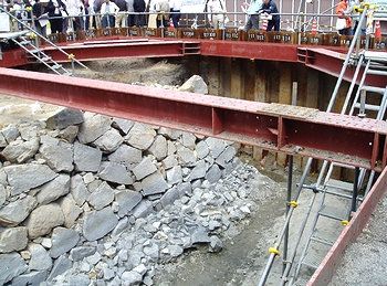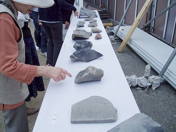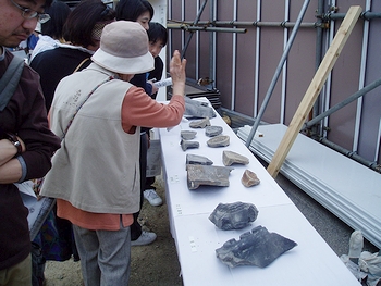 JR福山駅前(福山市三之丸町)の福山城外堀遺構の発掘調査現場で12日、市民を対象にした説明会があった。約600人が、出土した石垣や瓦を間近で見学し、江戸時代の1622年築城とされる城の威容に思いをはせた。