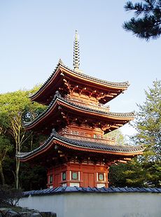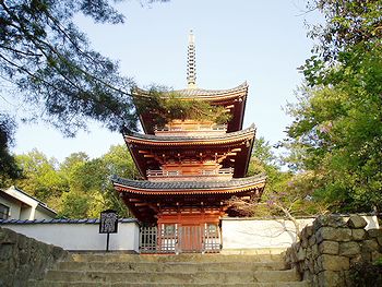 三重塔(さんじゅうのとう)は、1376年(永和2)に再建され、岡山県では2番目に古い塔となっている(最古は長福寺三重塔/英田町)。他の堂塔が禅宗様の建築様式であるのに対し、三重塔は朱塗りで和様を基本とした建築となっている。内部拝観不可。