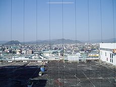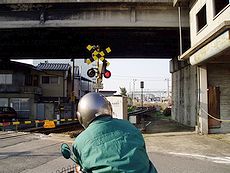 (左)(中)この吉備線の踏切では随分待たされました(^.-)☆ (右)宿泊ホテルの窓から総社市内を(^_^)v