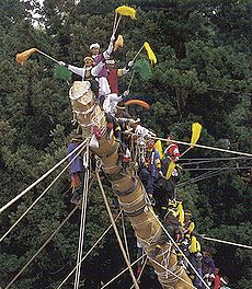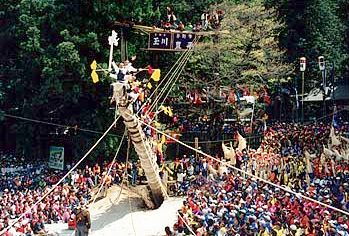 御柱の曳行・建立と宝殿の御造営などで、その起源はつまびらかでないが、社伝によると今から1,200余年前、桓武天皇の時、東征にあった征夷大将軍・坂