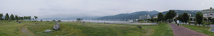 早朝散策時の諏訪湖の景観です 上諏訪駅付近です