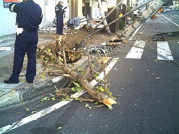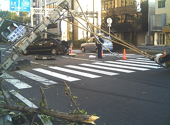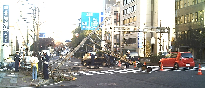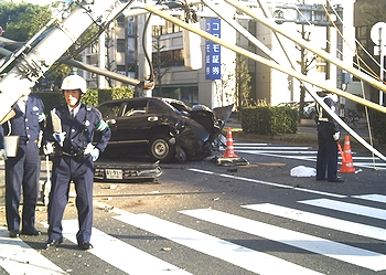 現場は片側三車線の直線。福山東署は、少年がハンドル操作を誤ったとみている。電柱は根本から折れ、信号機は約7時間後に復旧した。