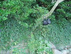 (左)豊川に架かります国道1号線・吉田大橋です (中)豊川沿いを散策です (右)バッグが無造作に木の枝に…