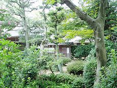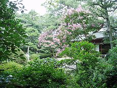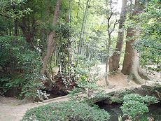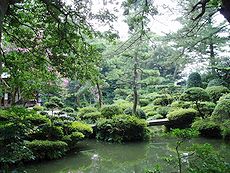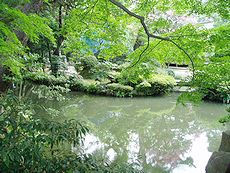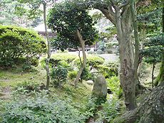 本庭は書院の南面から西面にかけて矩形に池泉を設け、池中に中島一島を作っている。これに南北の二橋を架け、向かって左手背後に築山を設け全体的に廻遊出来るようになっている。