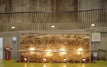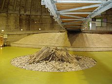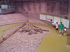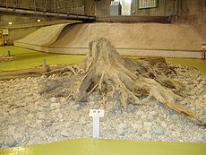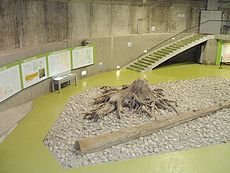 この場所は片貝川扇状地の末端に当たり、埋没林はこのような扇状地砂礫層に埋まっている。これは、発掘現場の地層の標本である。