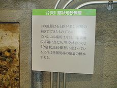 (中)片貝川扇状地砂礫層:この地層は石と砂が多く、河川の働きで出来たものである事を示している。
