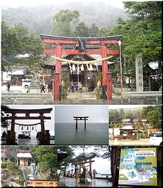 JR近江高島駅の南約2kmにある神社。湖中に朱塗りの大鳥居があり、国道161号線をはさんで社殿が立つ。「白鬚さん」「明神さん」の名で広く親しまれ、また、「近江の厳島(いつくしま)」とも呼ばれています。