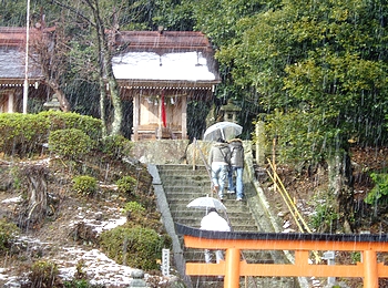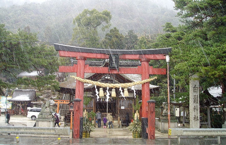たまたま白鬚神社が近付いて来ますと激しいミゾレが降り始めてしまいました。