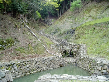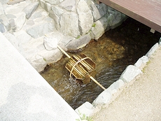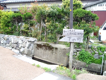 前川:熊川宿を流れる用水路です。以前はこの川で野菜を洗ったりしていました。今でも竹製の芋洗い水車が所々にかけられ、くるくると回っています。