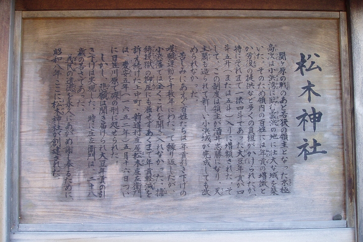 さらに進むと、若狭の義民、松木庄左衛門が祭られている「松木神社」があります。小浜藩の米蔵があった場所ともされており、境内にその旧跡が残っています。