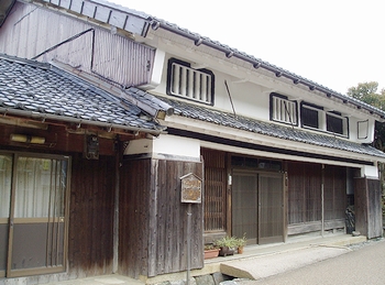主屋、土蔵など問屋の形式を残している最も古い町家です。表には2ケ所駒(こま)つなぎ環が付いています。典型的な平入造りで、塗込の壁や袖壁卯建(うだつ)、土戸の入った戸袋などに見られる店構えの重厚(じゅうこう)さから当時の問屋の栄えた様子がうかがえます。