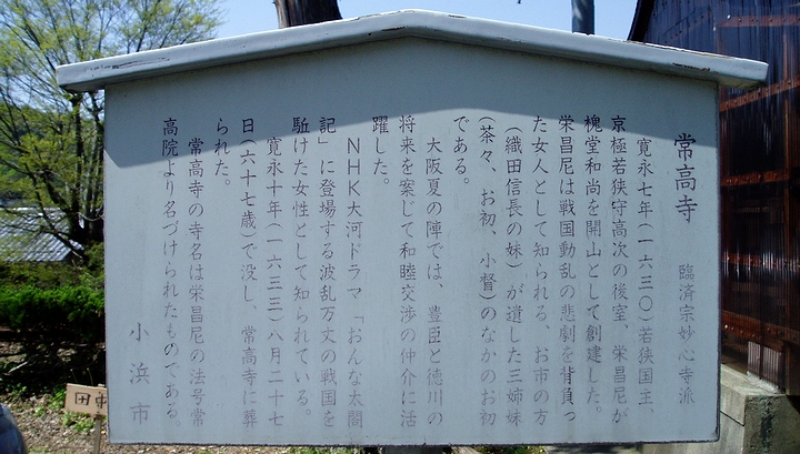 常高寺は、江戸時代初期の小浜藩主京極高次の妻、常高院(お初の方、信長の妹お市の方の次女)の発願によって建立された寺であります。